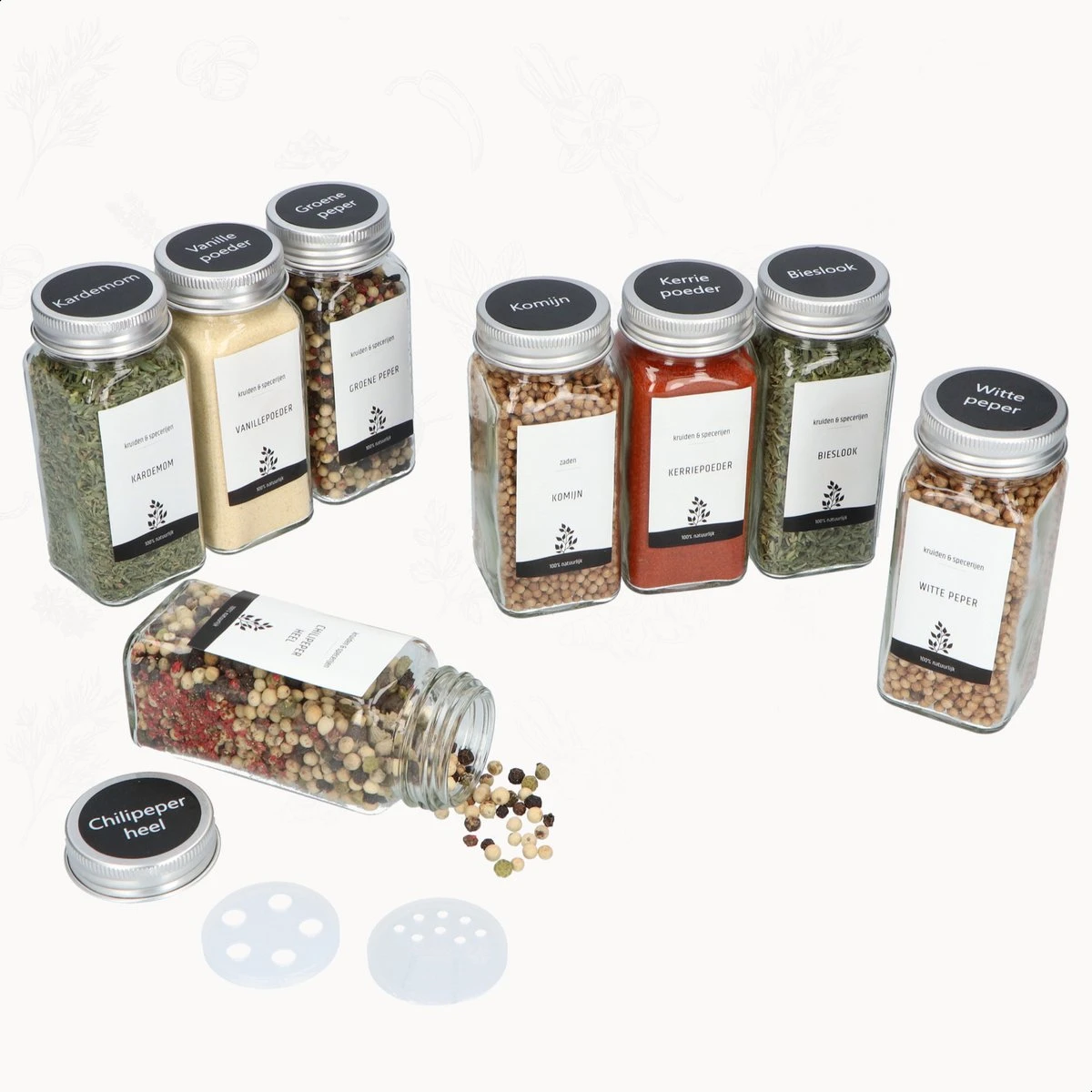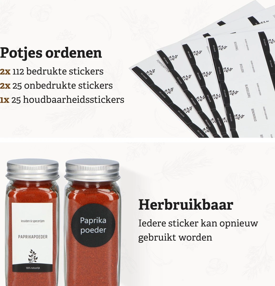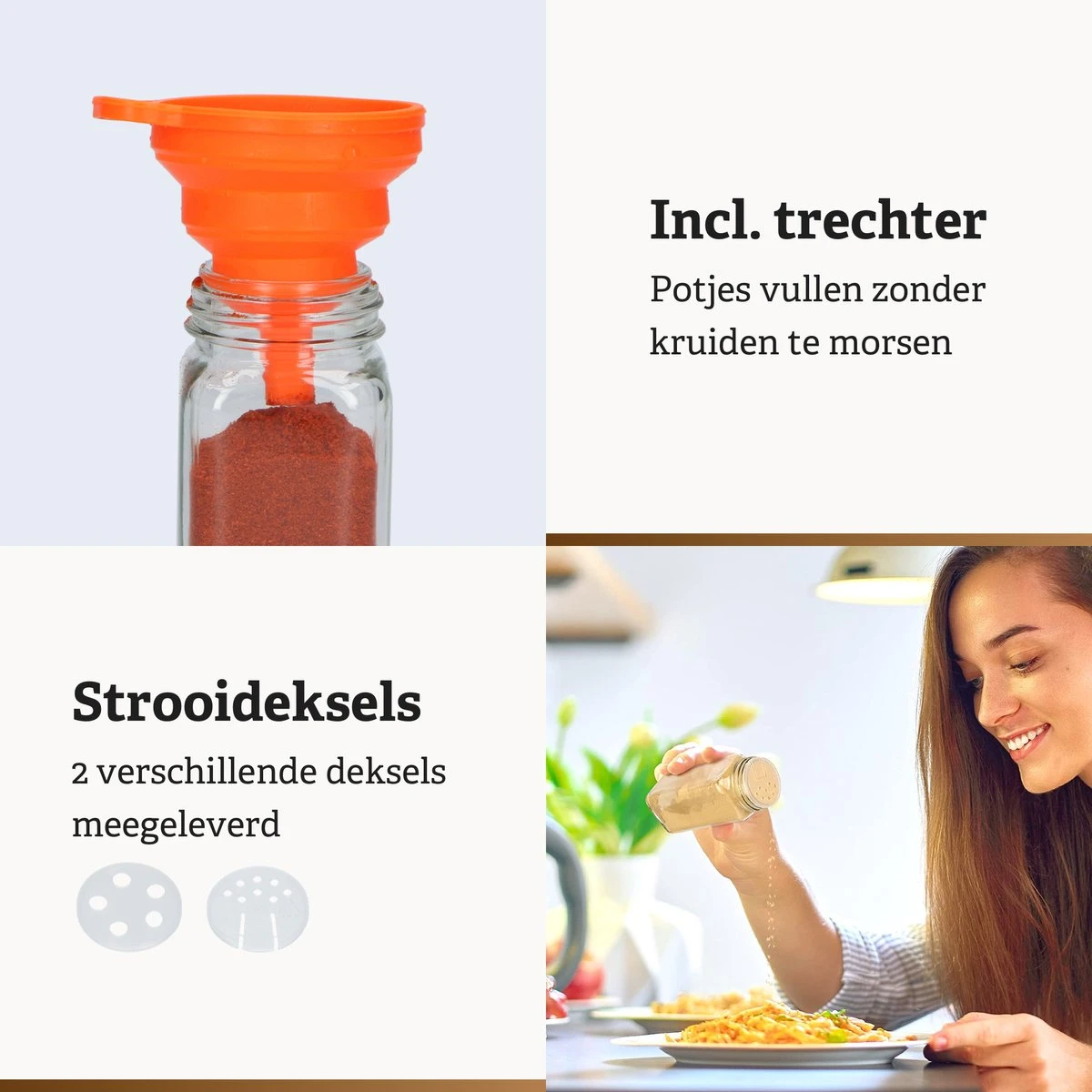 De kruidenpotjes set van Comforder bevat alles wat je nodig hebt. Naast de 25 kruidenpotjes met multifunctionele strooideksel en metalen draaideksel ontvang je ook nog een inklapbare trechter, 224 voorgedrukte stickers, 50 blanco stickers en een krijtstift voor deze stickers. Ook ontvang je 25 houdbaarheidsstickers en een kruiden checklist. Zo kun je de potjes gemakkelijk vullen met jouw kruiden en staat alles mooi en overzichtelijk in jouw kast of kruidenrek.