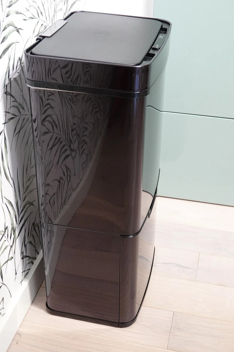 Zwart glimmende 4cookz® RVS Smart Waste afvalscheidingsprullenbak met sensor – 72 liter – anti vingerafdruk coating. Ben je op zoek naar een mooie en doordachte afvalemmer voor een betaalbare prijs? Dan zit je goed met deze afvalemmer van 4cookz®. Deze stalen afvalemmer met sensor waardoor hij open en dicht gaat zonder dat je hem hoeft aan te raken. Hij is voorzien van een speciale coating waar je geen vingers er op ziet. Een prachtige aanvulling in je keuken, maar ook praktisch!