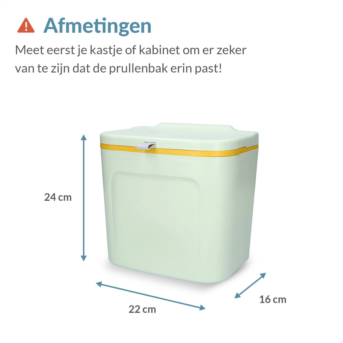 De prullenbak is eenvoudig hangend te installeren met de meegeleverde montageaccessoire (1 haak en 1 plakbord). Klein en perfect passend voor de meeste kastdeuren. Voor het ophangen met de haak mag de deur niet dikker als 2,5cm zijn. Onze prullenbak heeft niet alleen het perfecte formaat voor het aanrecht in de keuken, maar past ook onder de gootsteen.