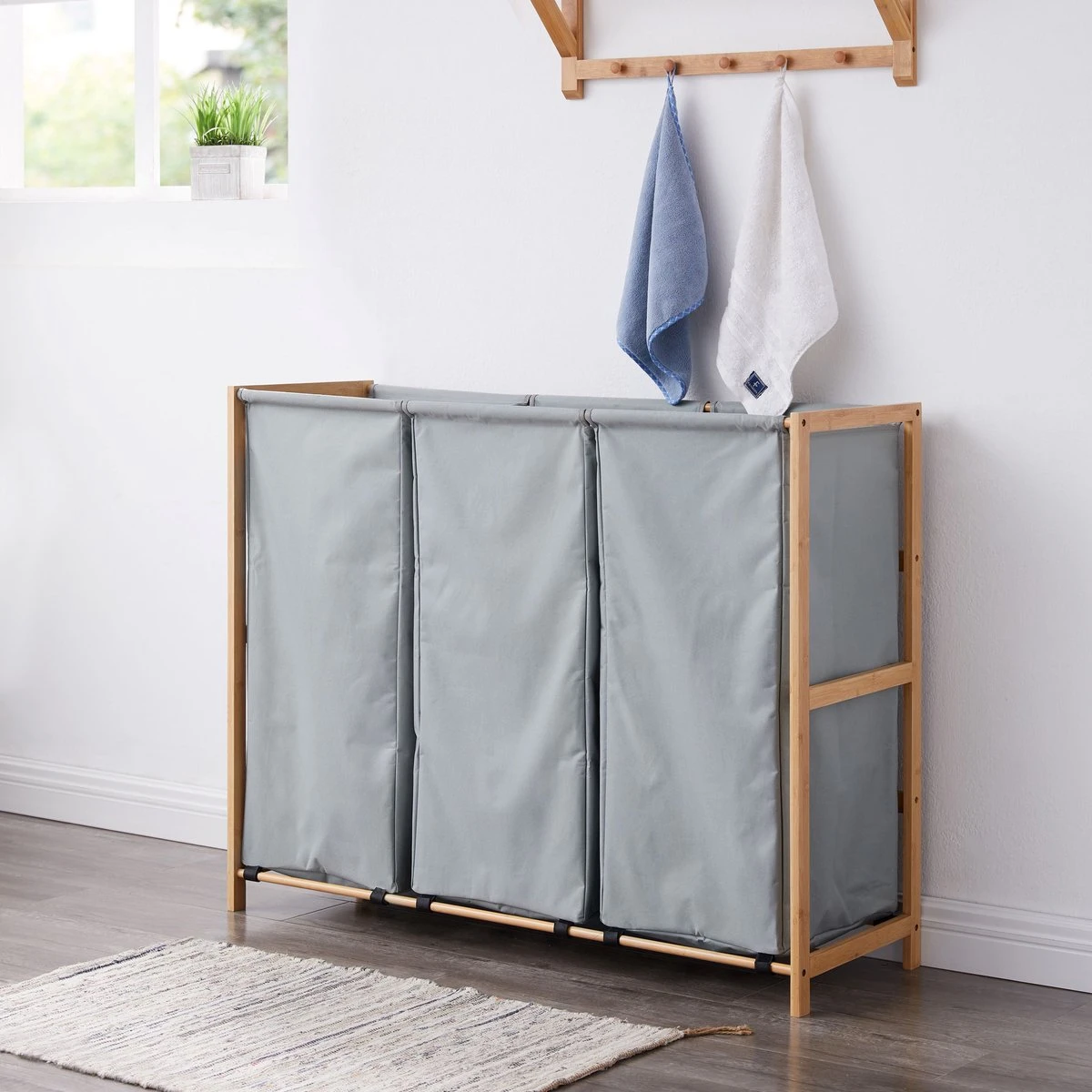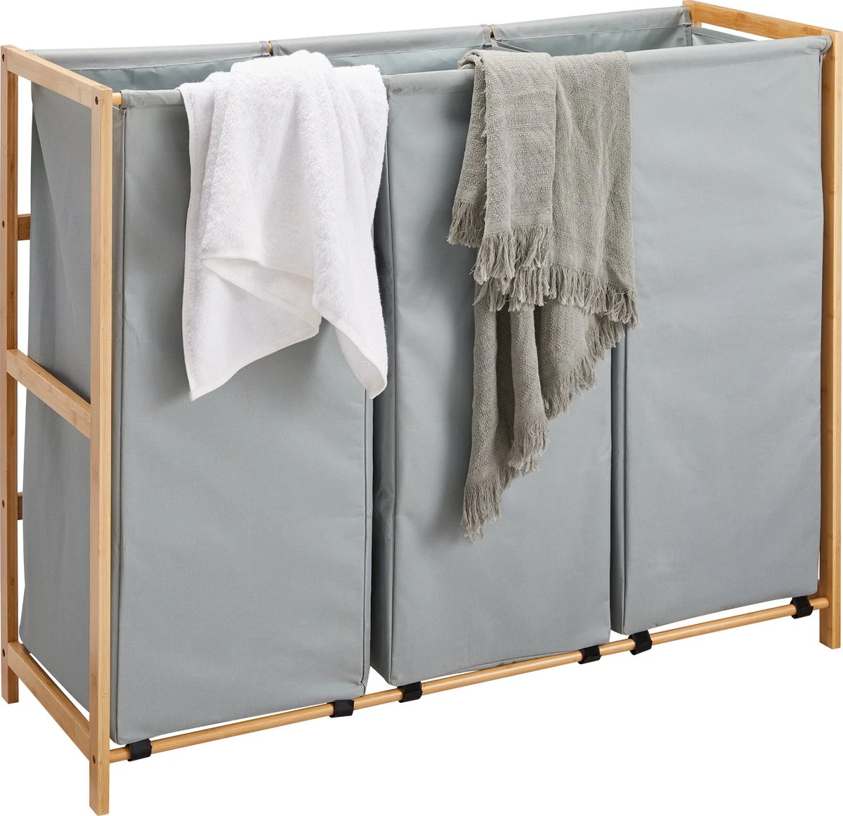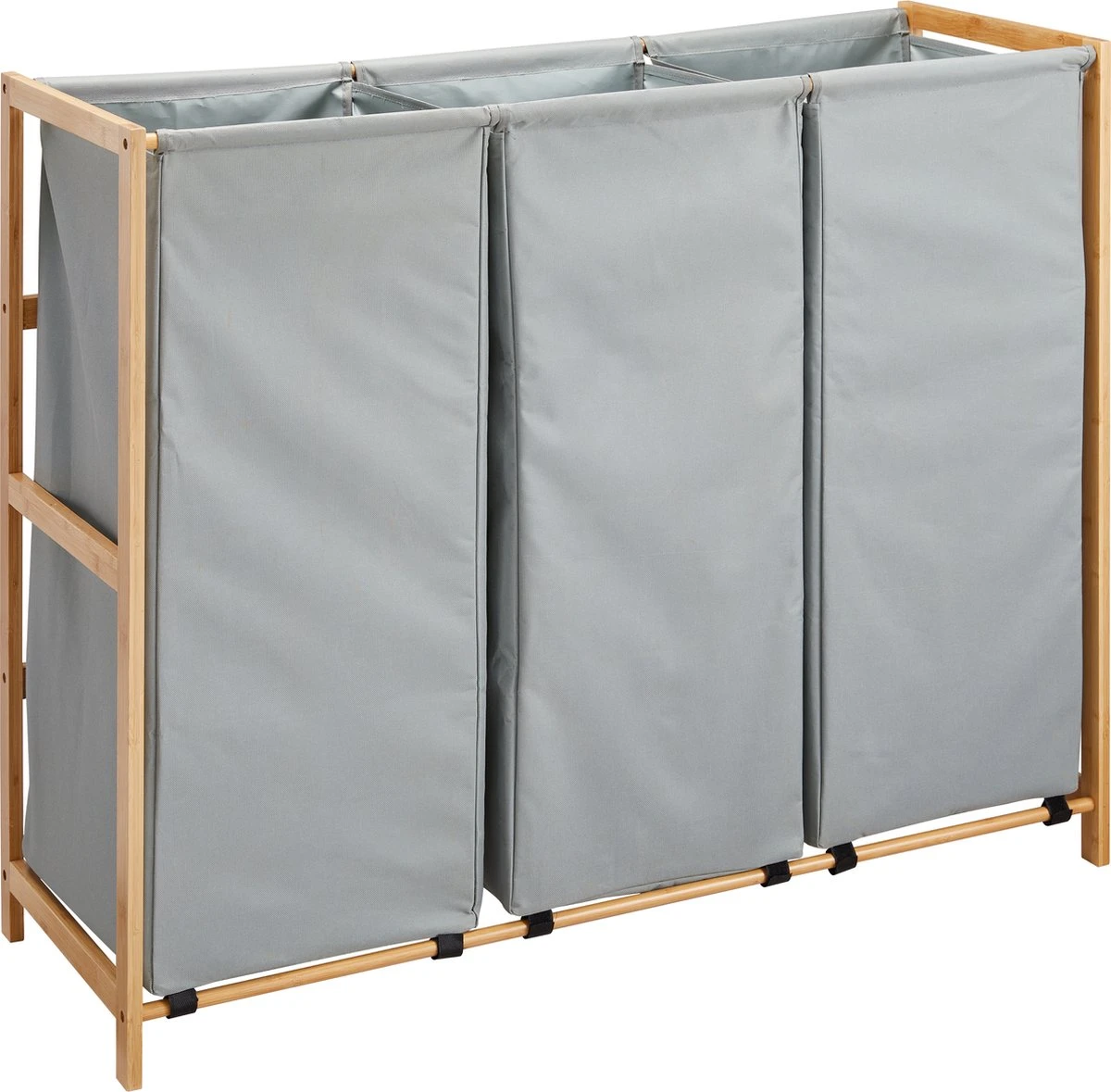 Ultra lichte constructie: De wasmand heeft een houten frame met 3 stoffen zakken zodat je deze gemakkelijk kan optillen.