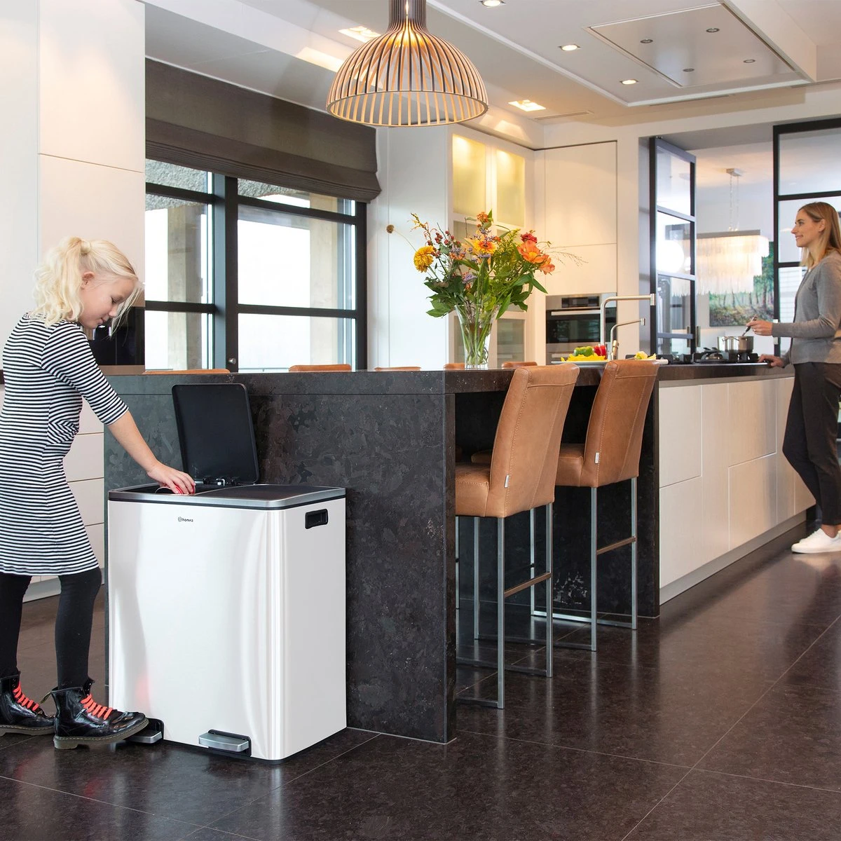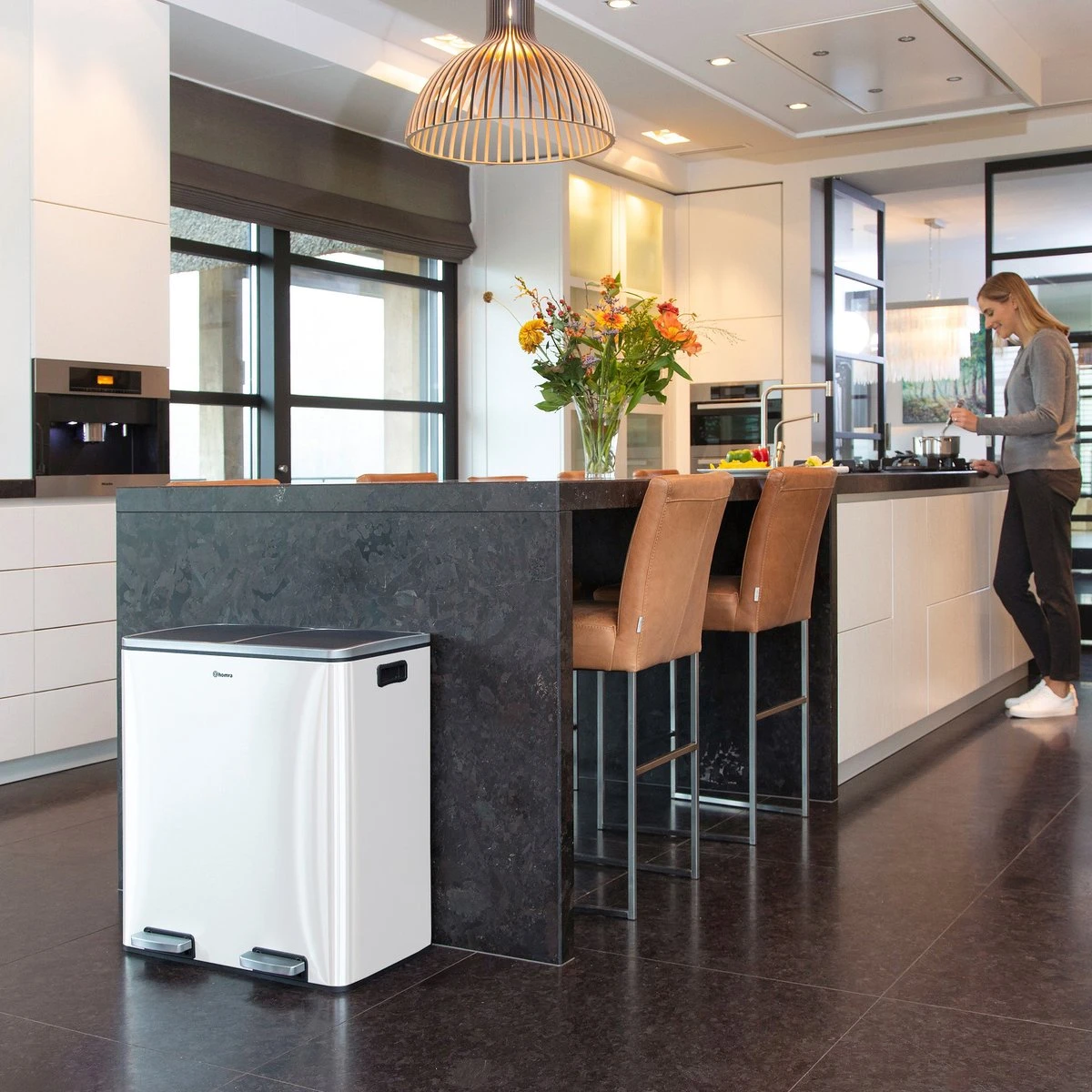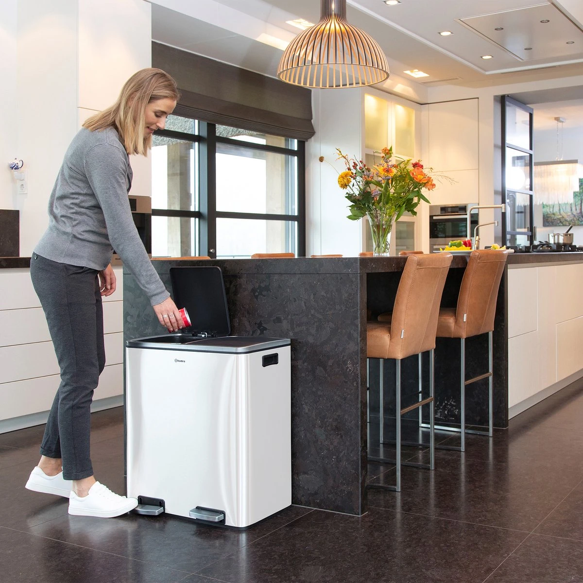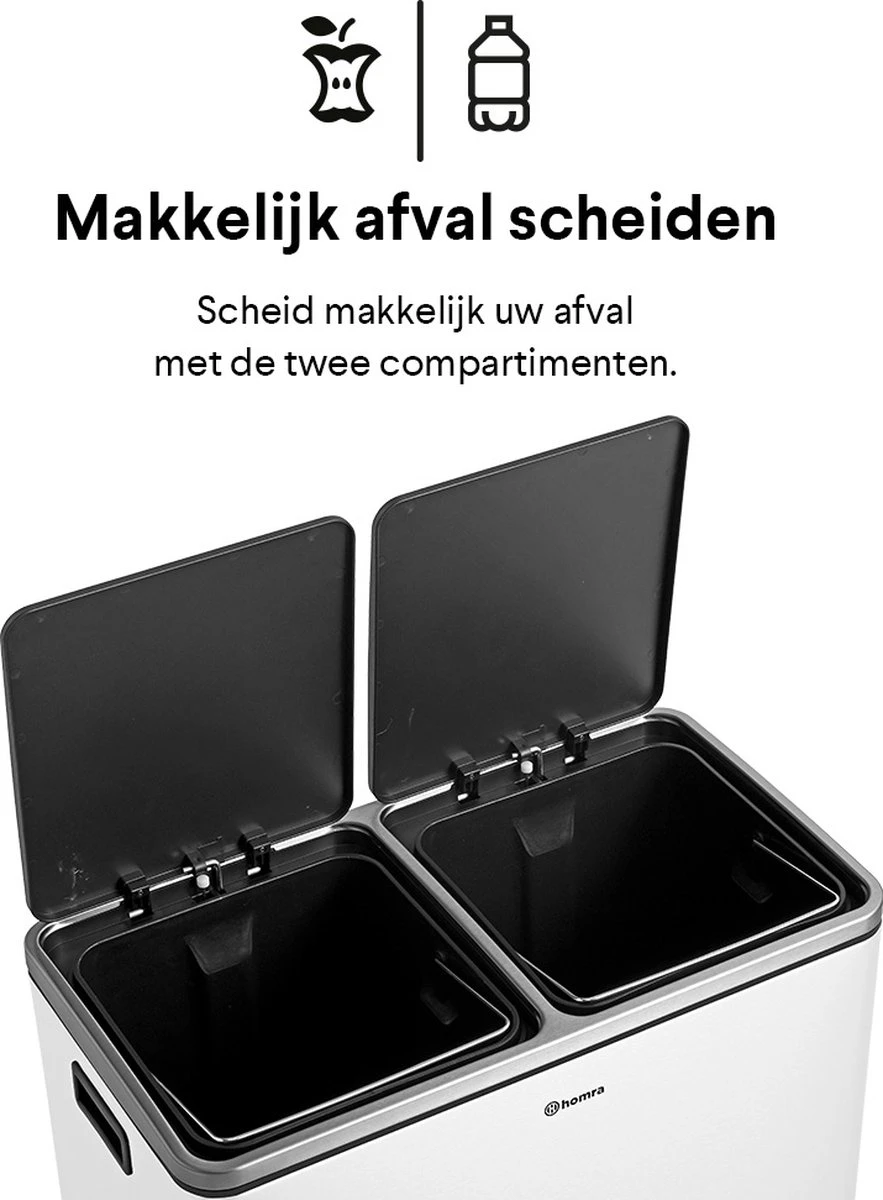 Mooie witte afvalscheidingsprullenbak met 60 liter inhoud (2 x 30 liter). Handig en hygiënisch in gebruik en met een luxe uitstraling. Ideaal voor thuis en op kantoor!