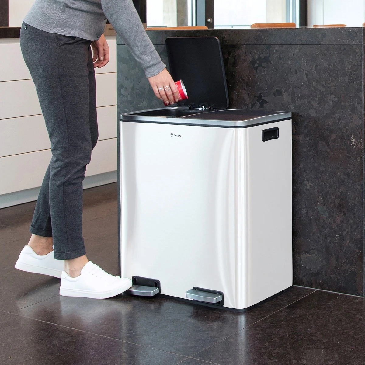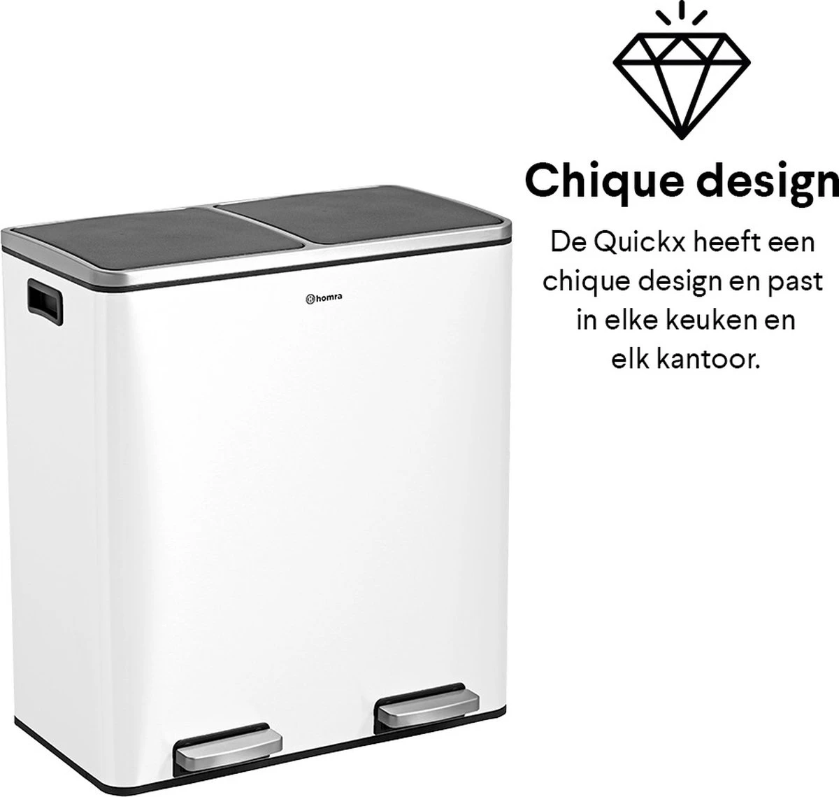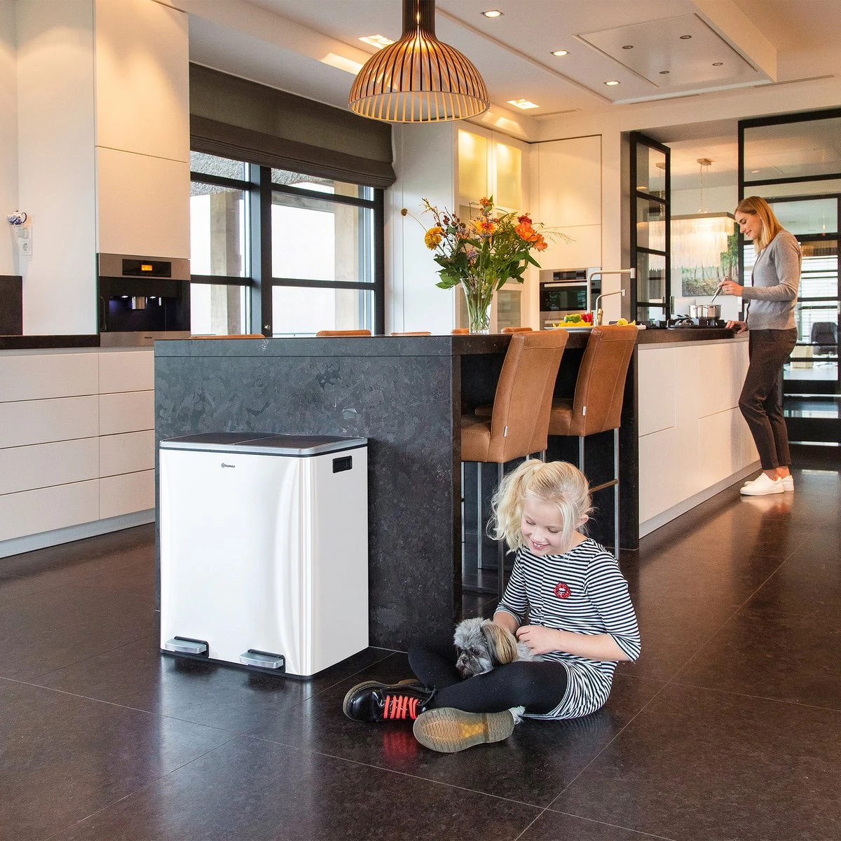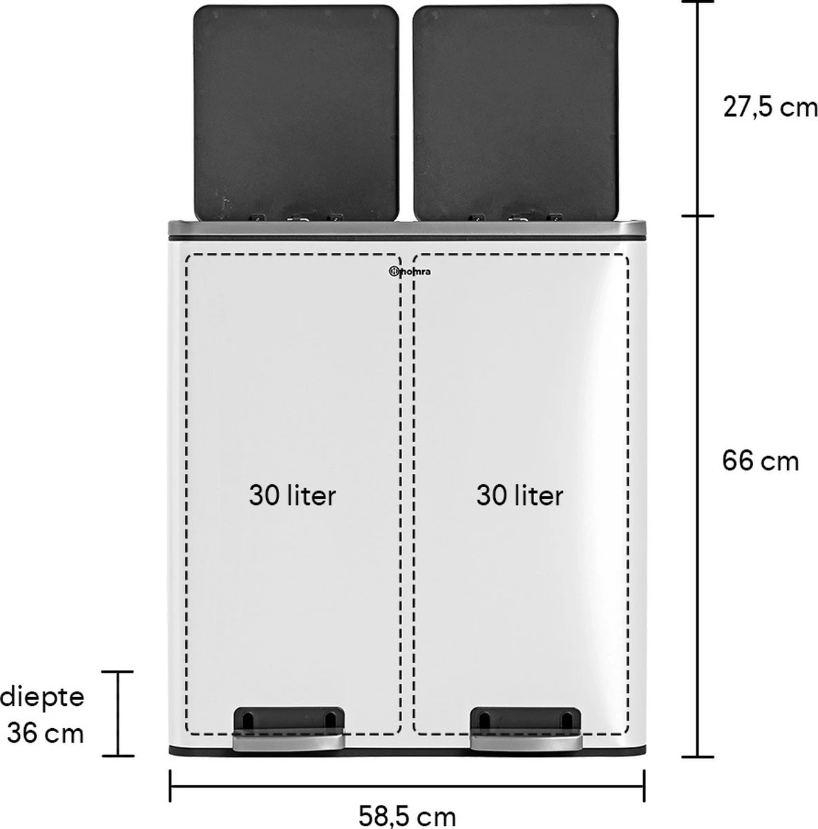 Mooie witte afvalscheidingsprullenbak met 60 liter inhoud (2 x 30 liter). Handig en hygiënisch in gebruik en met een luxe uitstraling. Ideaal voor thuis en op kantoor!