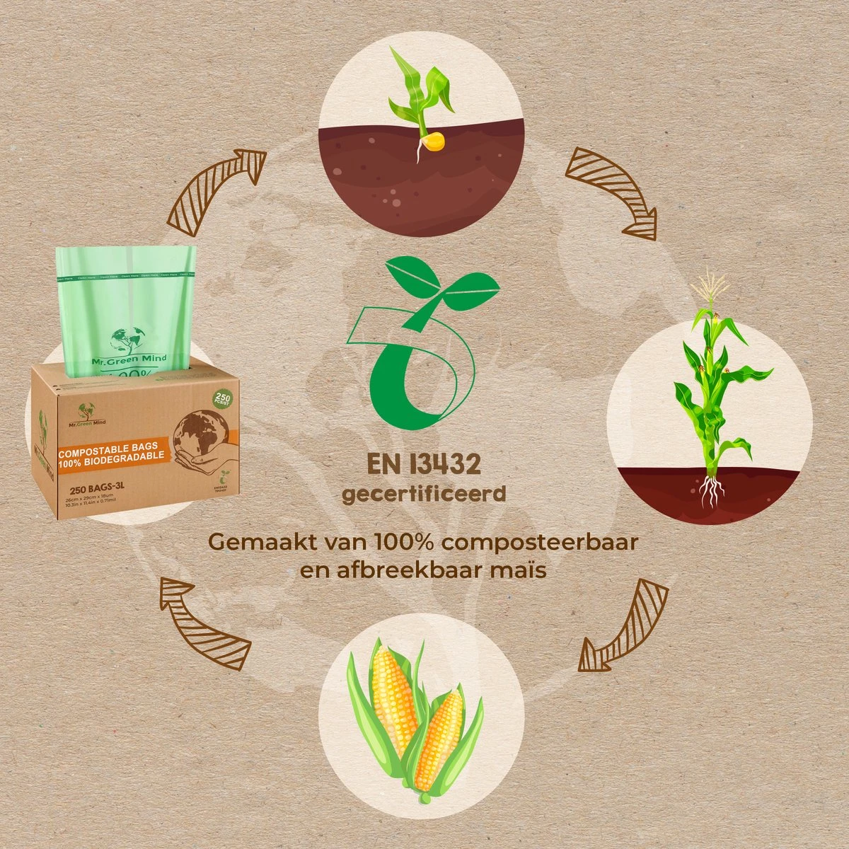 Composteerbaar – De zakjes zijn gemaakt van maïs en eindigen dus niet in de plastic soep. Ze voldoen aan de Europese composteringsnorm EN-13432.