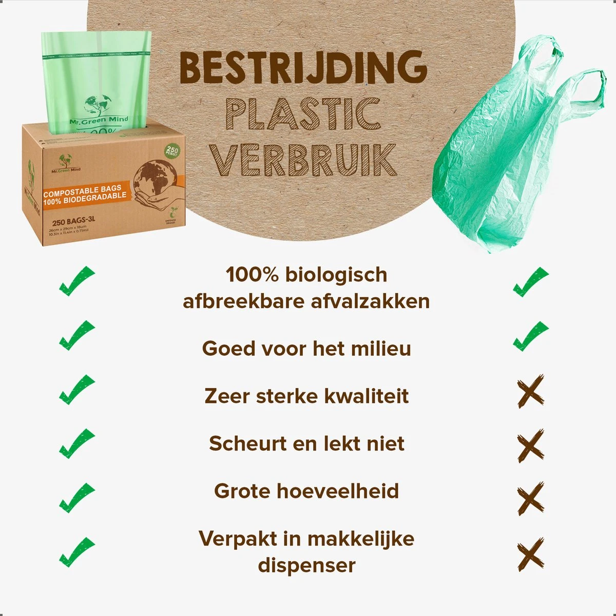 De Mr. Green Mind composteerbare afvalzakken zijn een milieubewust alternatief op normale vuilniszakken, en maken afval scheiden een eitje. Kies vandaag voor afbreekbaar maïs en draag ook bij aan een gezondere planeet!
