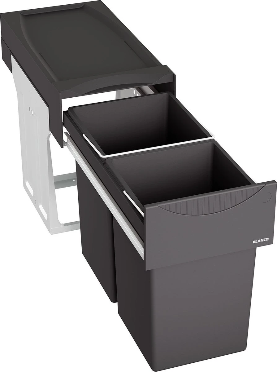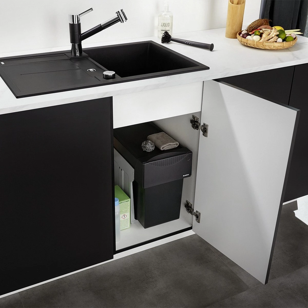 De Blanco inbouwafvalemmers schuiven helemaal naar buiten open waardoor je makkelijk het afval weggooit. Hij heeft twee binnenemmers, hierdoor is afval scheiden een fluitje van een cent en denk je braaf aan het milieu!