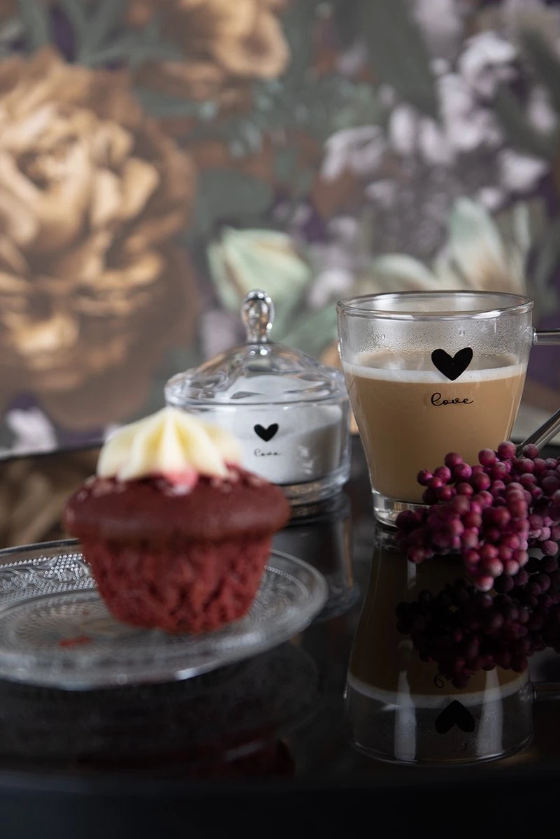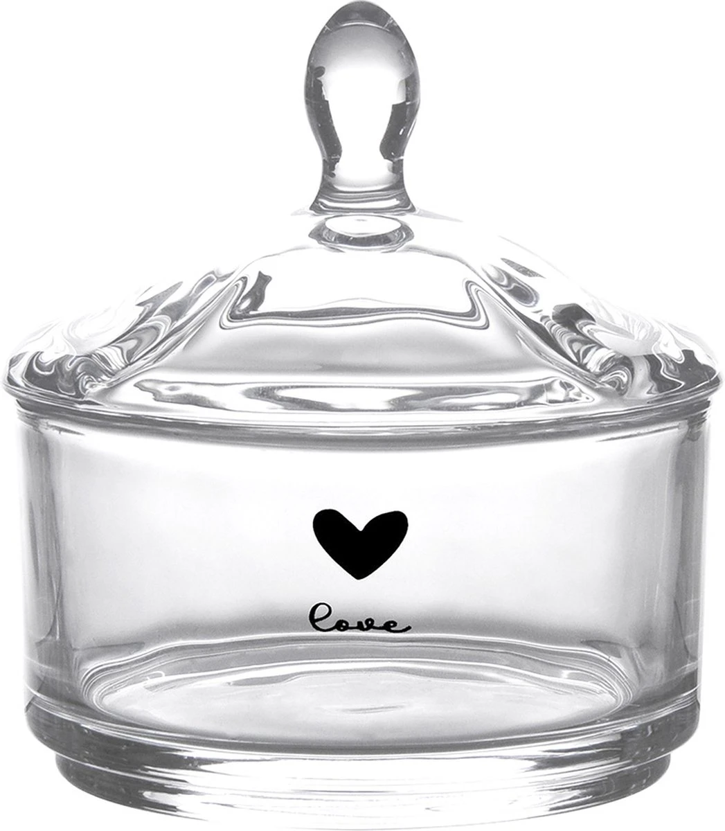Mooi transparant landelijk glazen schaaltje, bonbonnière met een deksel met een opdruk van een zwart hartje en de tekst LOVE van het merk Clayre & Eef. Voorraadbus Bewaarpot Opbergpot