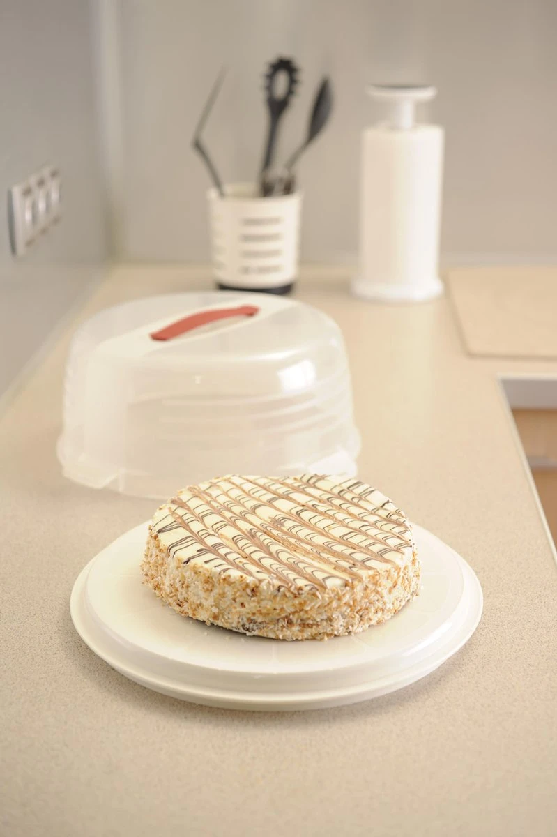 Deze taartdoos van Curver is onderdeel van de Chef@Home serie, die volledig in het teken staat van de thuisbakker. Omdat de doos transparant is kan je makkelijk zien wat er in zit. De kunststof clips sluiten de taartdoos luchtdicht af waardoor de taart langer vers blijft. Daarnaast kan je de box makkelijk dragen door de handige rubberen handgreep. Als kers op de taart staan op het plateau snijvlakken waardoor je de taart makkelijk kunt snijden, in 12 of in 24 stuks.