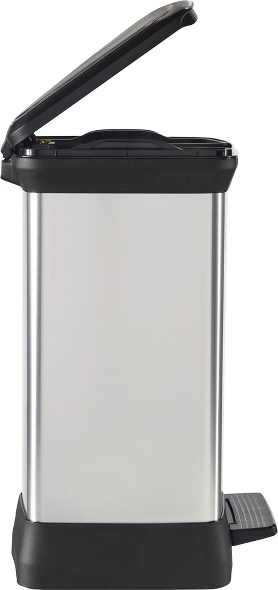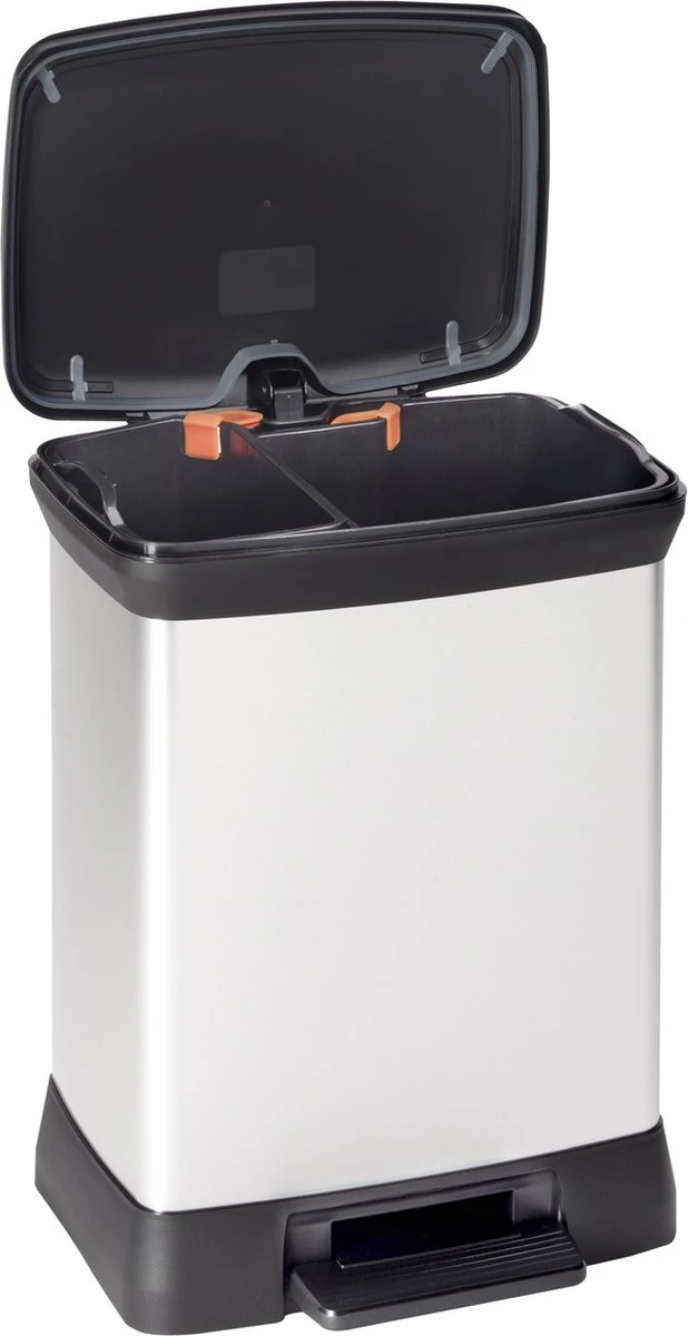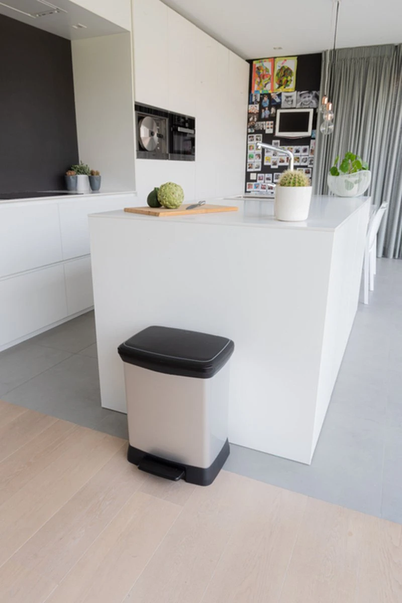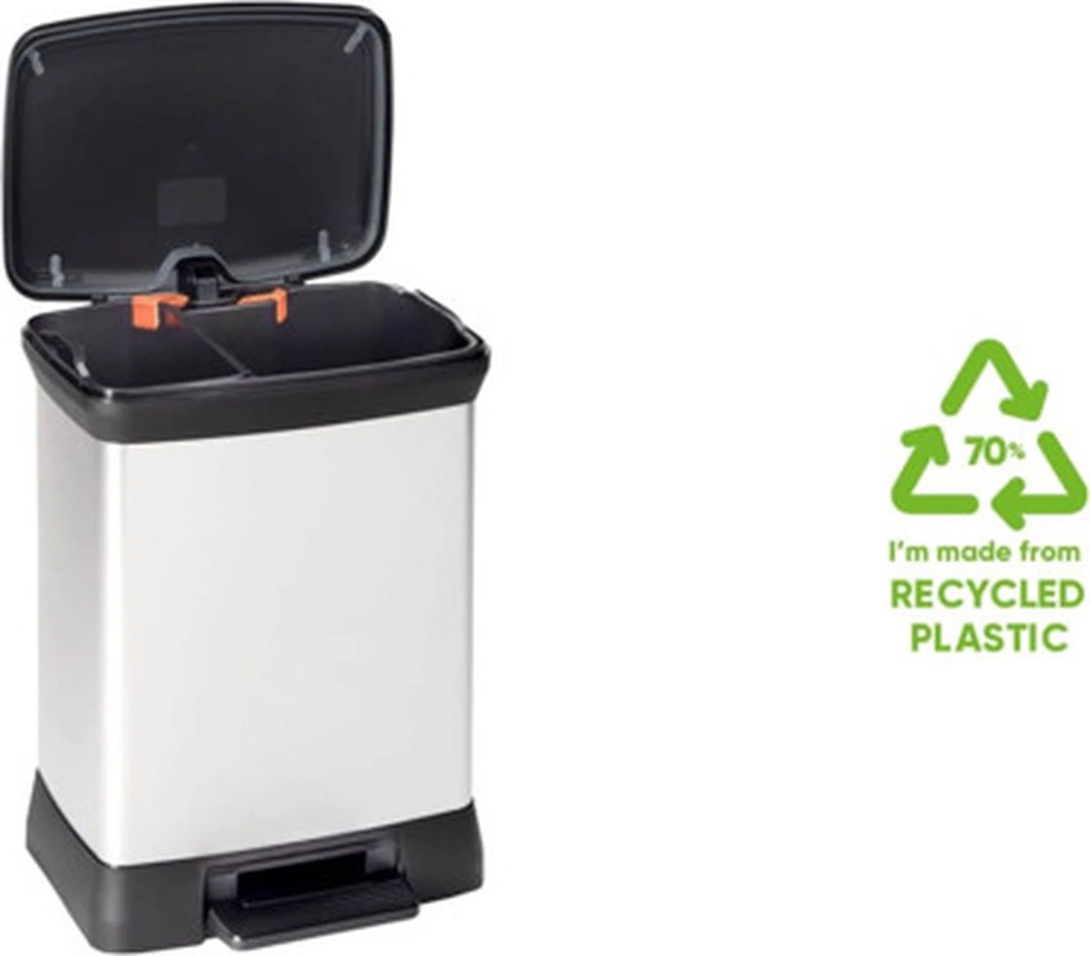 De Curver Duo Decobin Afvalbak – Rechthoekig – 10L + 18L – Metallic is een design product onder de afvalbakken. De bak is voorzien van twee verschillende binnenemmers, zodat het erg gemakkelijk wordt om je afval te scheiden. Eén binnenemmer van 10L en één van 18L. Deze pedaalemmer is voorzien van een breed en comfortabel pedaal en een flexibele rand in het deksel waardoor nare geurtjes niet kunnen ontsnappen. Verder heeft het deksel een soft-close mechanisme waardoor het geruisloos sluit. Deze afvalbak heeft de stijlvolle uitstraling van een metalen afvalbak maar de voordelen van kunststof; roest niet, deukt niet, licht van gewicht, vingerafdrukken zijn niet zichtbaar. Daarnaast is deze afvalbak ook een duurzame oplossing doordat hij is gemaakt van 70% gerecycled kunststof. Kortom een product dat onmisbaar is in jouw huishouden.