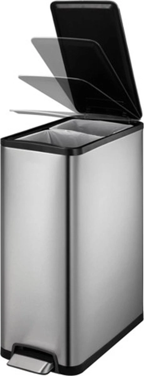 De matzilverkleurige EKO Ecoslim pedaalemmer met een inhoud van 40 L is een trendy afvalemmer met twee kunststof binnenbakken van 20 L voor afvalscheiding.