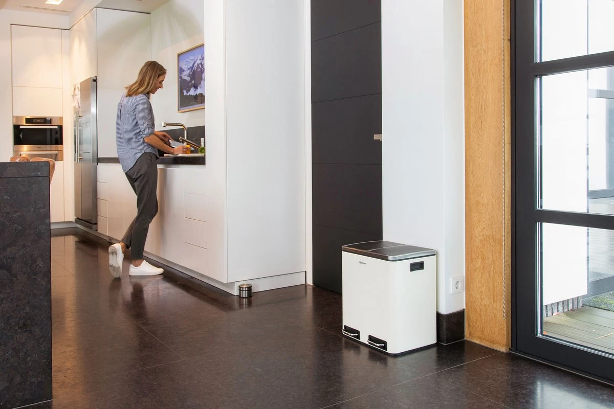 Een groot pluspunt van de prullenbak zijn de losse deksels. Als je afval wilt weggooien open je het juiste compartiment met het voetpedaal. Daarna gooi je het afval makkelijk en snel weg. Het andere compartiment blijft gesloten dus je opent alleen het compartiment dat je nodig hebt!