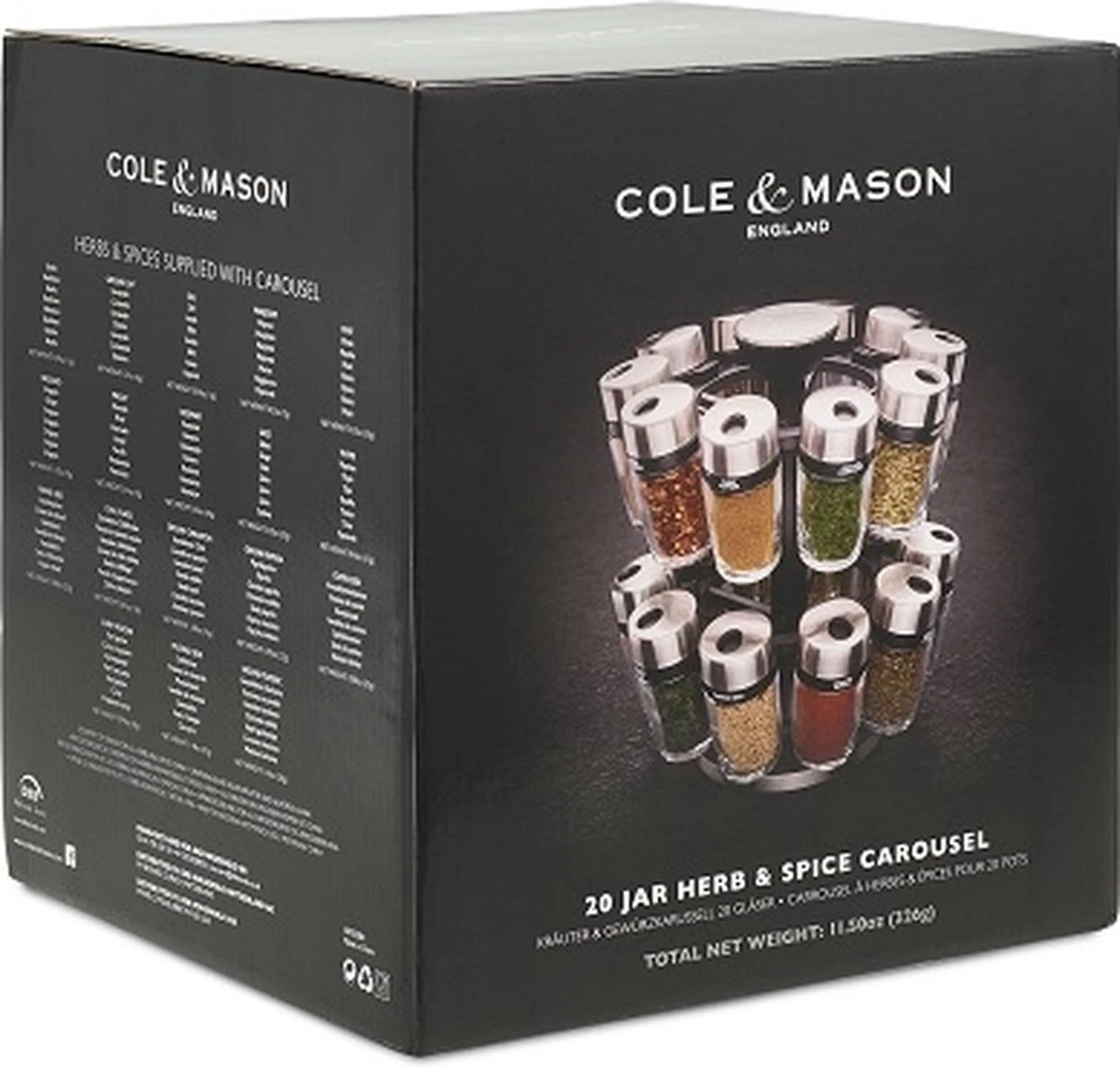 Kruidenrek, 20 potjes van het merk Cole & Mason. Het kruidenrek is gemaakt van hoogwaardig RVS en heeft een stijlvol uiterlijk! Dit kruidenrek past perfect op ieder aanrecht en zo heeft u uw kruiden altijd binnen handbereik! De grote roestvrijstalen knop zorgt ervoor dat u het rek eenvoudig rond kan draaien of op kan tillen. De kruiden zitten allemaal in mooie glazen potjes. De deksels van de potjes hebben drie functies: schudden ( meerdere gaatjes), gieten (groot gat), en gesloten. Deze potjes zijn ook eenvoudig bij te vullen zodat u heel lang plezier kunt hebben van dit kruidenrek!