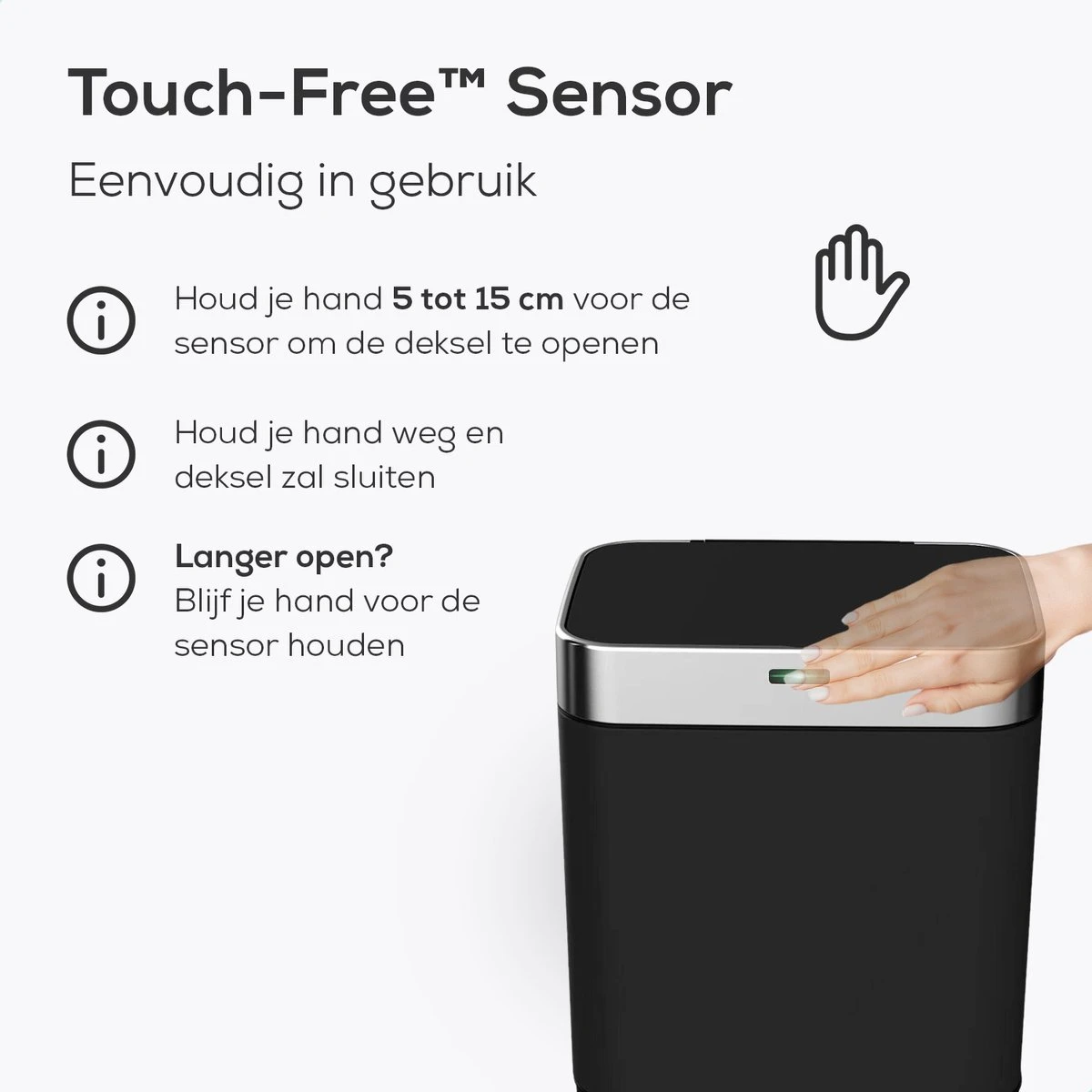 De Loftey sensor afvalbak reageert op beweging en opent en sluit zich automatisch, zonder de deksel aan te raken. Je kunt de deksel van de prullenbak gemakkelijk openen door je hand op 5 tot 15 cm afstand van de deksel te houden. De deksel zal zich direct openen en na 5 seconde ook weer automatisch sluiten. Langer nodig? Houd je hand gewoon langer voor de sensor om de afvalbak open te houden.
