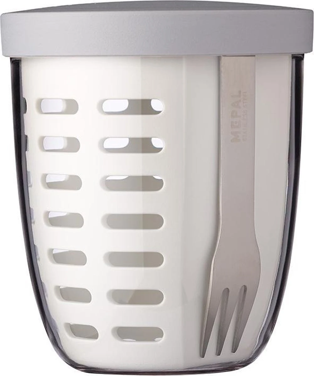 Mepal fruit- & veggiepot Ellipse in wit. Gezonde snoepers opgelet: meer groente en fruit eten wordt je vanaf nu wel héél makkelijk gemaakt. De fruitbox van Mepal is speciaal ontworpen om je fruit of groente ter plekke te wassen. Verse aardbeien prikken achter je computer of een vieruurtje van snoeptomaatjes in de trein… kom maar door met die vitamines! Het vergietje in de pot is zo ontworpen dat je jouw groente en fruit ter plekke even af kunt spoelen. Doordat er een beetje ruimte overblijft op de bodem kan je snack uitlekken zonder dat jij daar last van hebt. Een handig RVS vorkje wordt meegeleverd, zodat jij kunt genieten van de ideale snackbox voor onderweg! Natuurlijk mag de fruit- en veggiepot na gebruik gewoon in de vaatwasser. Ook heel handig: de deksels van de fruit- & veggie-, lunch- en snackpotten zijn onderling uitwisselbaar. De fruitbox is ook geschikt als snackbox of snackdoosje voor kinderen.