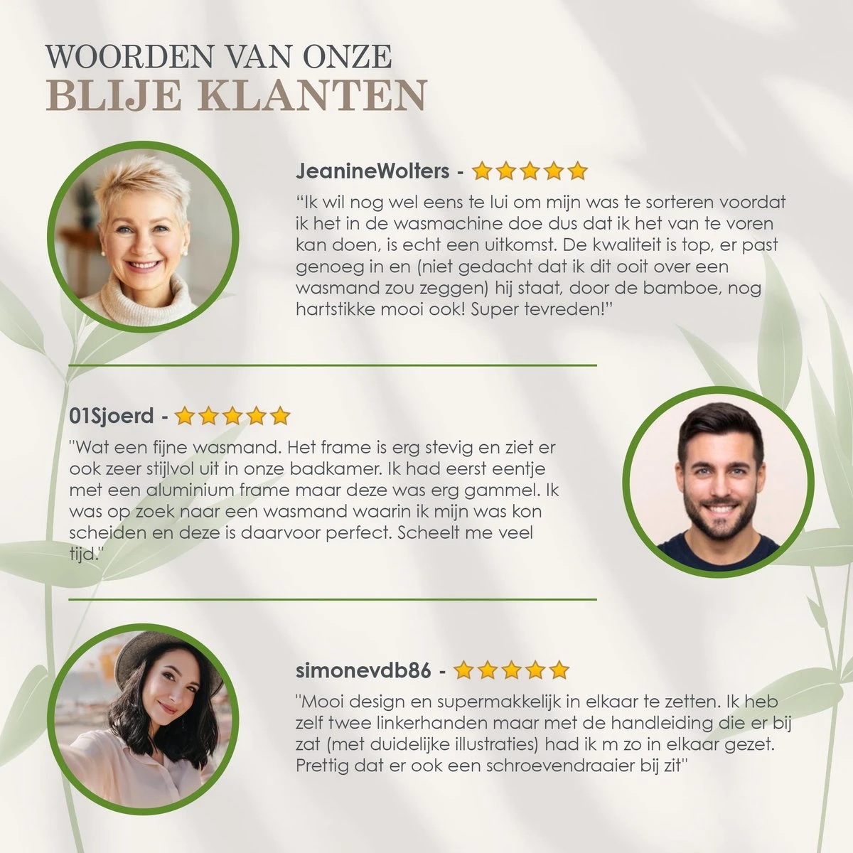 De wasmand is gemaakt van twee duurzame materialen: bamboe en Oxford. Het bamboe frame zorgt er voor dat deze robuust is en niet na een aantal maanden uit elkaar valt. De waszakken zijn van Oxford, een weeftechniek van polyester waarbij een coating is toegevoegd om deze 100% water- vuilafstotend te maken. Je kunt de waszakken eenvoudig afnemen met een doekje. Daarnaast is de wasmand opvouwbaar en kun je deze dus opbergen wanneer je hem niet nodig hebt.