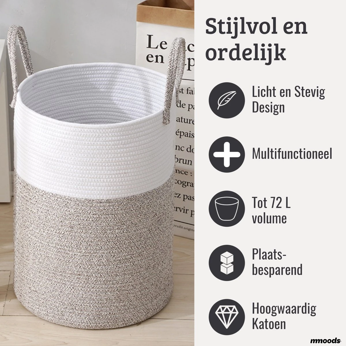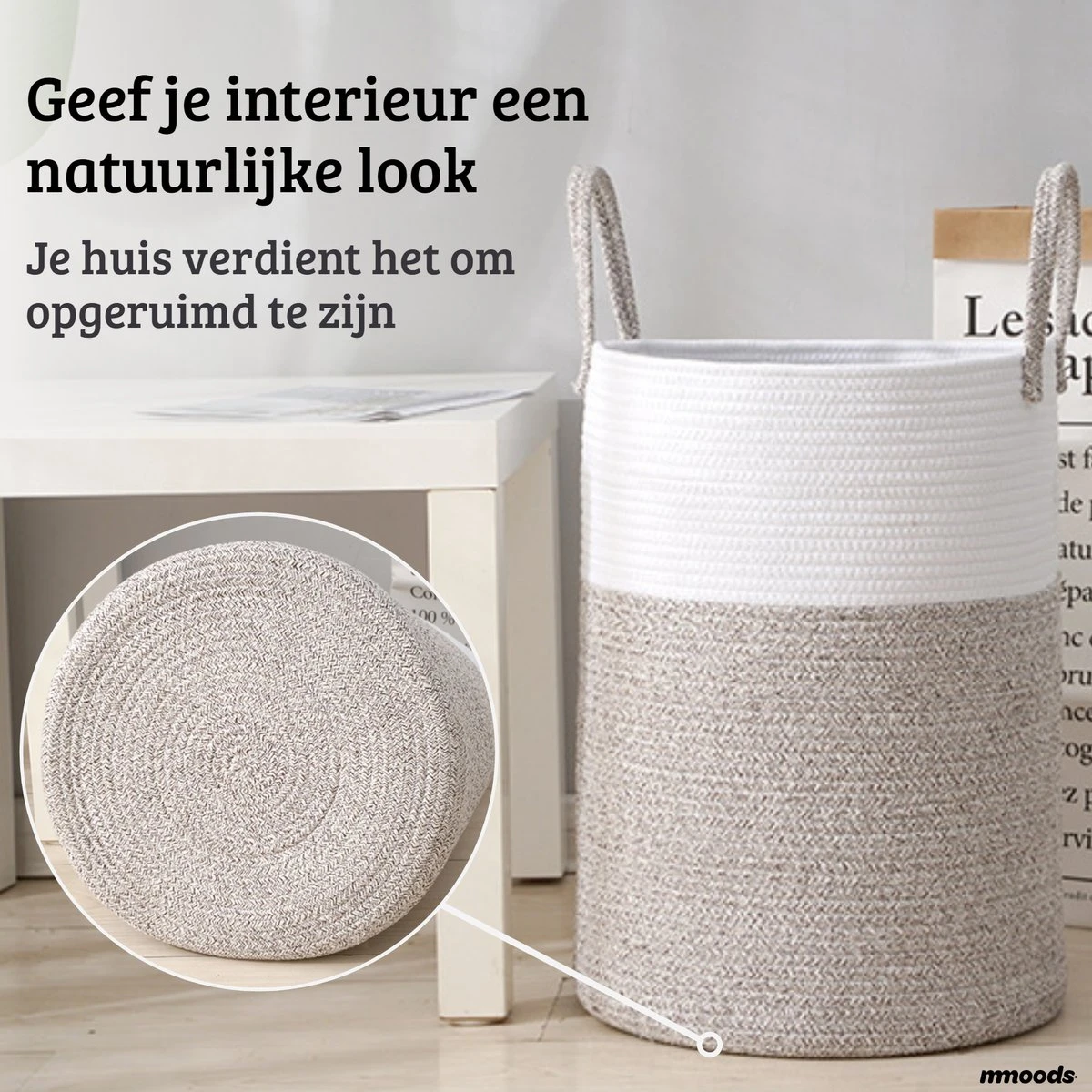 Maak kennis met onze Mmoods katoen wasmand – de perfecte oplossing om uw slaapkamer en badkamer georganiseerd en rommelvrij te houden.
