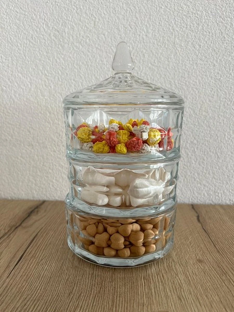Het zal zeker mooi ogen op je feesttafel of op je kast als het gevuld is met verschillende snoepen of koekjes. Ook kan het gebruikt worden voor gedroogde fruiten. Als je koeken of snoep over hebt kan het ook makkelijk bewaart worden in deze elegante bonboniére.