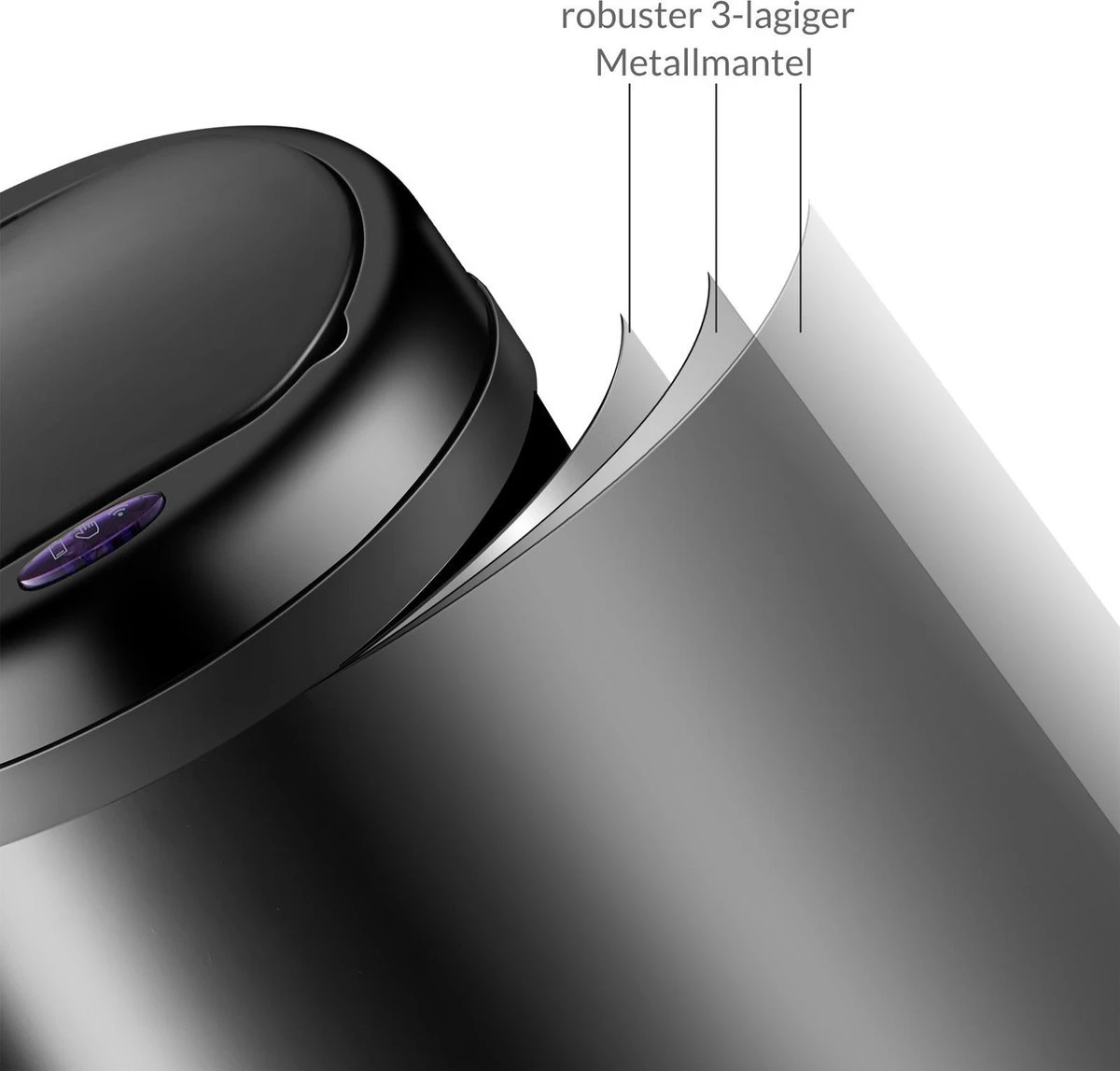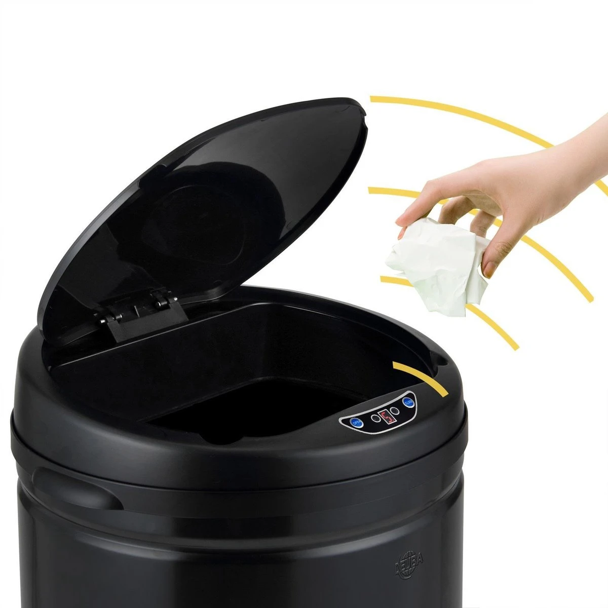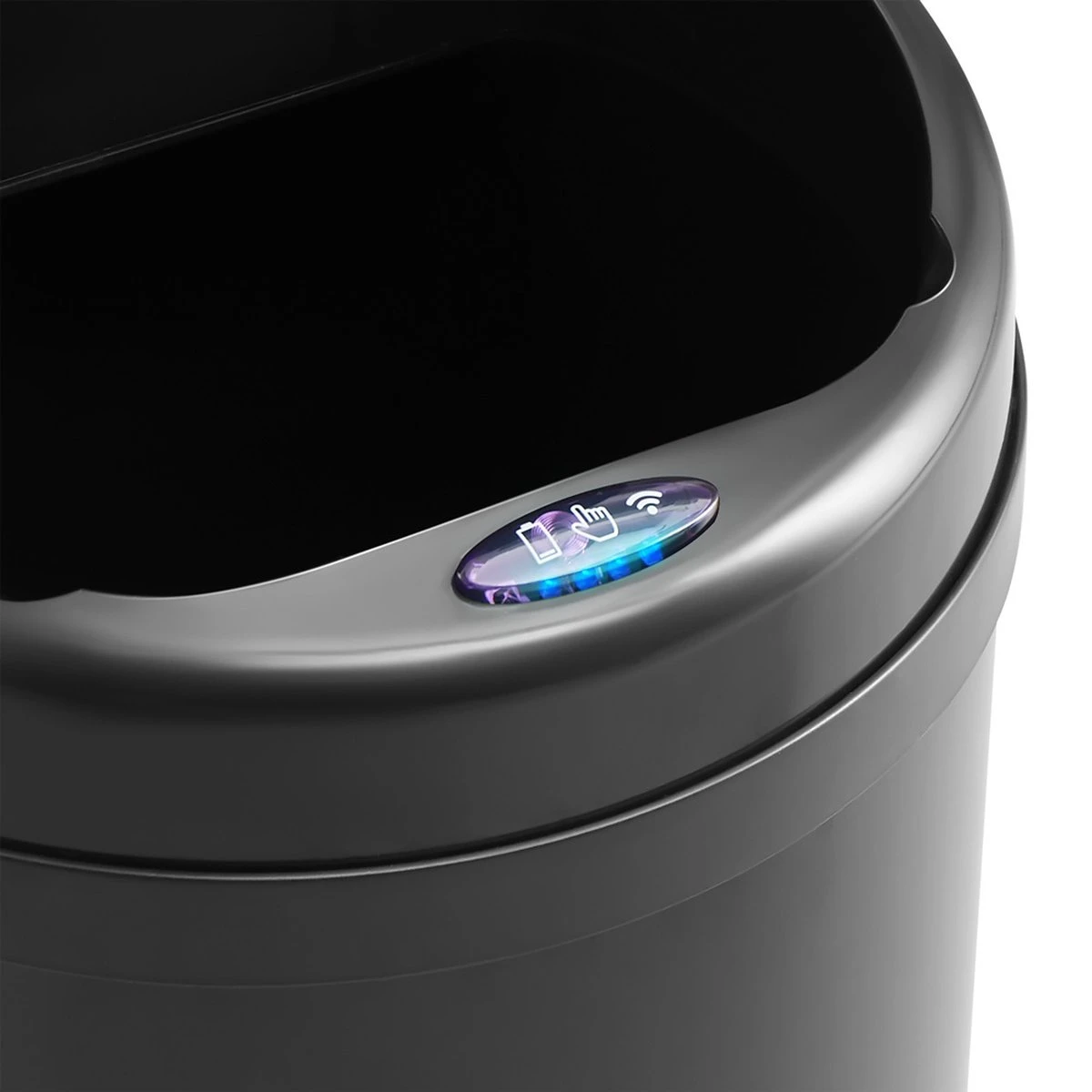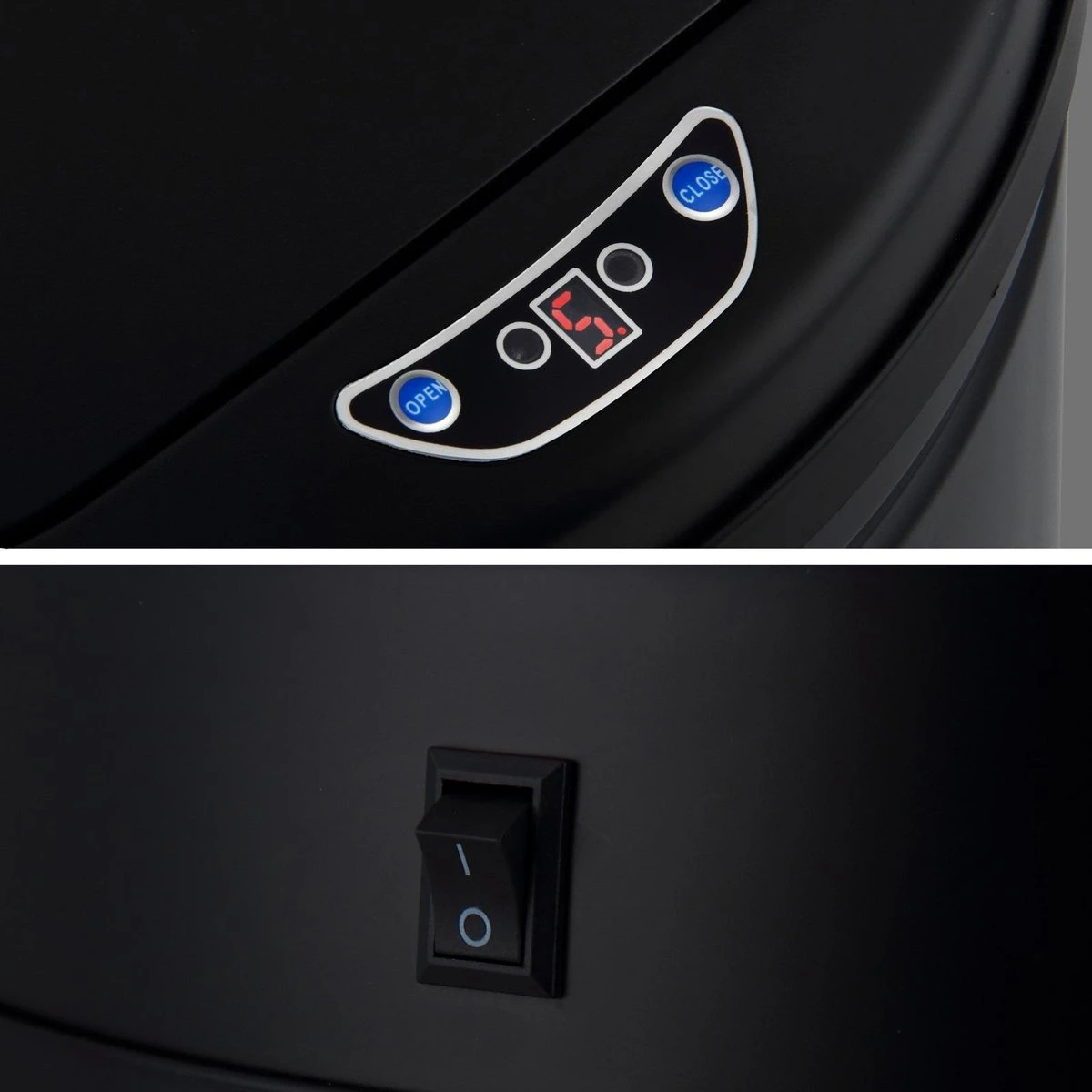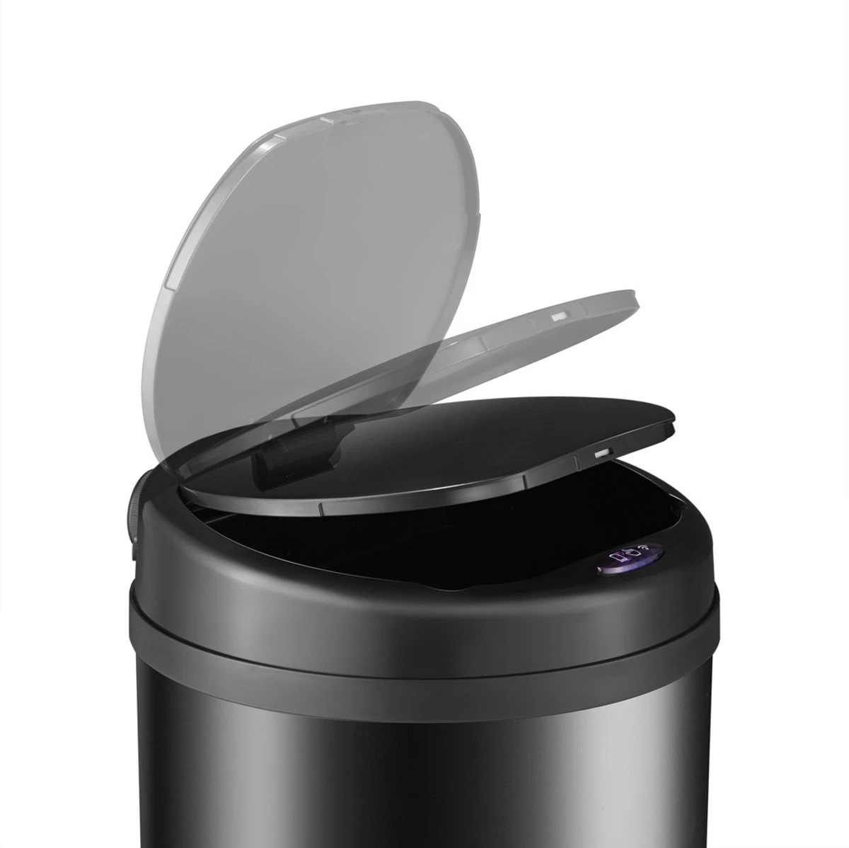 De sensor werkt op batterijen. Je kunt de sensor ook uitzetten met de ON/OFF knop die op de prullenbak is bevestigd.
