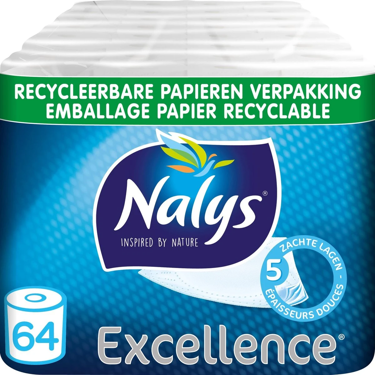 | Verpakkingsinhoud | Nalys Excellence papier verpakking 8 rollen word verkocht in verpakking van 8×8 rollen. Aantal rollen in verpakking: 64. Fabrikant: Sofidel Benelux N.V./S.A. A. Stocletlaan 3 2570 Duffel |
