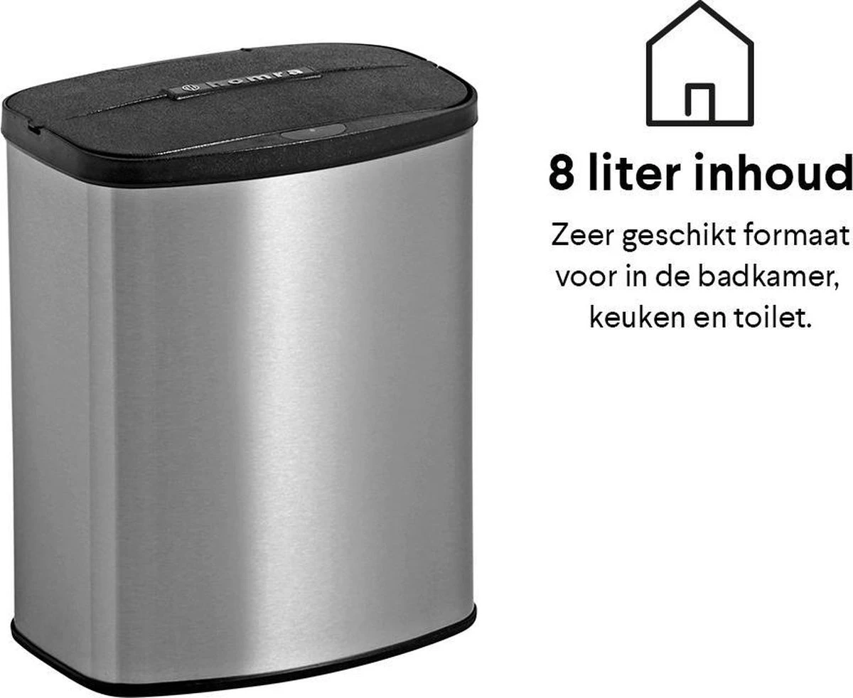 Handig in gebruik, stijlvol in de badkamer of keuken en ook nog eens een leuke prijs; deze Homra sensor prullenbak van 8 liter heeft het allemaal! Nooit meer afval uit uw handen laten vallen terwijl u het deksel van uw prullenbak probeert open te doen, of een pedaal dat blijft hangen waardoor de prullenbak helemaal niet open wil, deze Homra sensor prullenbak gaat open zodra hij detecteert dat u er iets in wilt doen!
