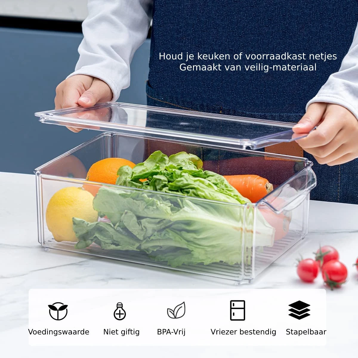 - 【Houd groenten en fruit vers】 Elke koelkast-organizer wordt geleverd met een deksel dat de inhoud beschermt tegen pletten, vocht en stof, en voorkomt dat stinkende voedingsmiddelen en andere items in de koelkast zich verspreiden.