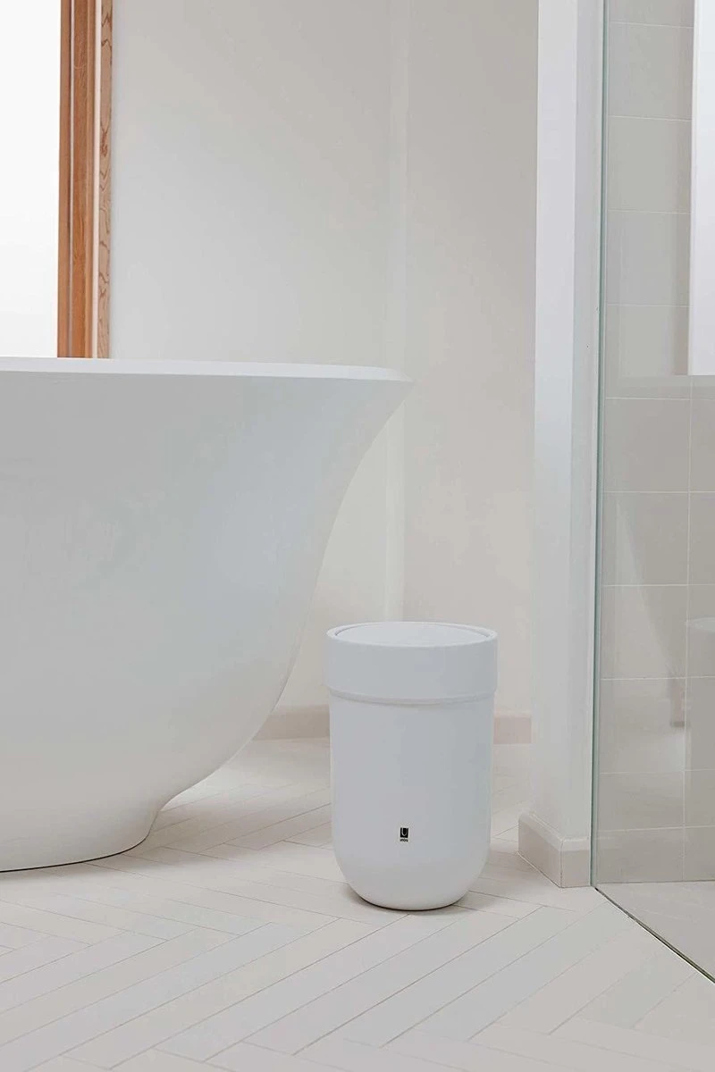 Mooie stijlvolle prullenbak Touch van Umbra. Met een brede rand waar een platte deksel in zit welke kan ronddraaien. Ook verkrijgbaar in de Touch serie van Umbra: zeeppomp, zeepbakje, toiletborstel, tandenborstelhouder en beker. Afmeting: 19,4 x hoogte 30 cm Inhoud: circa 6 liter Materiaal: kunststof